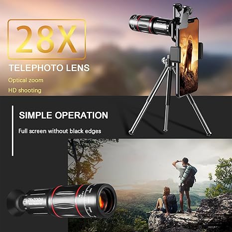 - 28x telephoto lens Magnification of distant objects,Overcomes the disadvantage that mobile phone photography cannot be viewed from a distance. so that distant scenes clearly reappear before your eyes. When using telephoto lenses, avoid shaking.A tripod is recommended for better results Ideal for watching concerts, birds,and Scenery in the distanceetc.
