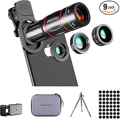- 4 in 1 HD phone camera lens Sets,designed for photography hobby lovers, the kit includes a 28x telephoto lens for,198° of fisheye lens, 20x macro lens, 0.6x wide angle lens,And various accessories.ake your ordinary mobile phone camera lens and turn it into a photographer’s camera for your photographic hobby needs.It’s a photographer perfect gift.