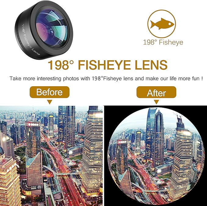 • 【3 in 1 Phone Camera Lens Kit】: Leknes Upgraded cell phone lens kits includes 120°Wide Angle Lens +198°Fisheye Lens + Macro Lens. With the 120°Wide Angle lens , it can largely expand the field of view and enable you to capture the entire family or a whole team member into one picture;Fisheye Lens create funny circular pictures, make you fall in love with photography; Macro lens lets you see the world around you closer than ever before!